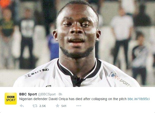 David Oniya morreu neste sábado durante um jogo amistoso na Malásia. O zagueiro nigeriano de 30 anos sofreu um mal súbito com cerca de três minutos em campo, foi atendido imediatamente ainda dentro do gramado, mas não resistiu e sua morte foi anunciada depois de 30 minutos no hospital. Após a confirmação da morte, a partida entre a equipe do jogador, T-Team contra o Kelantan foi suspensa. Segundo o presidente do clube de T-Team, Syahrizan Mohd Zain, o atendimento demorou para acontecer. "Ele sofreu um ataque cardíaco, mas poderia ter sido uma história diferente. Nosso zagueiro foi privado de oxigênio por vários minutos", reclamou, em entrevista reprduzida pelo The Guardian.